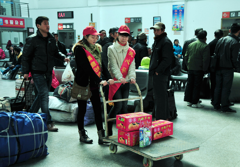 來自揚汽集團(tuán)和團(tuán)市委組織的志愿者們有的在進(jìn)站口向旅客指引車站售票、候車等各個功能區(qū)位置;有的在服務(wù)臺回答旅客咨詢;有的在安檢處勸導(dǎo)旅客把攜帶的物品放上危險品檢查儀安檢;有的推著“雷鋒車”幫行李較多的旅客拖運箱包;有的給候車的旅客倒上一杯熱水;有的在檢票口幫助維持現(xiàn)場秩序,避免發(fā)生擁堵;還有的在候車大廳勸導(dǎo)旅客請勿吸煙……