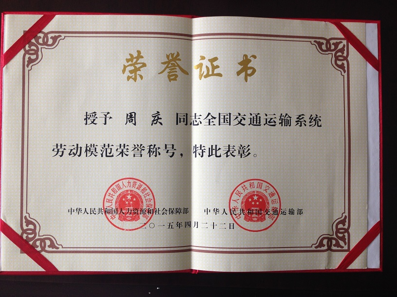 駕駛員周慶榮獲“全國交通運輸系統(tǒng)勞動模范”稱號