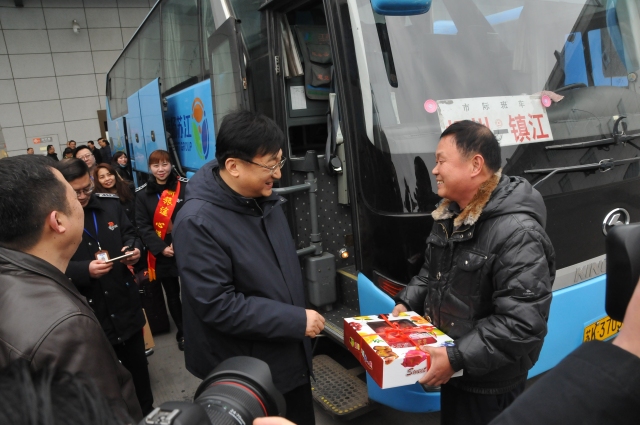 在發(fā)車區(qū),丁市長來到揚州至鎮(zhèn)江的班車旁,給駕駛員師傅送上了象征平安吉祥的大蘋果,并叮囑駕駛員師傅,一定要注意安全,要將旅客平安送到他們的親人身邊。