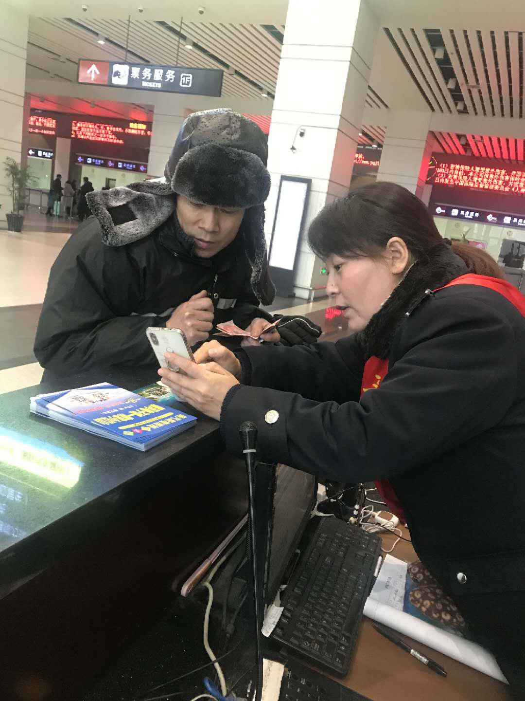 農(nóng)民工兄弟頂風(fēng)冒雨購(gòu)票回家,站務(wù)員熱心相幫助他們返鄉(xiāng)