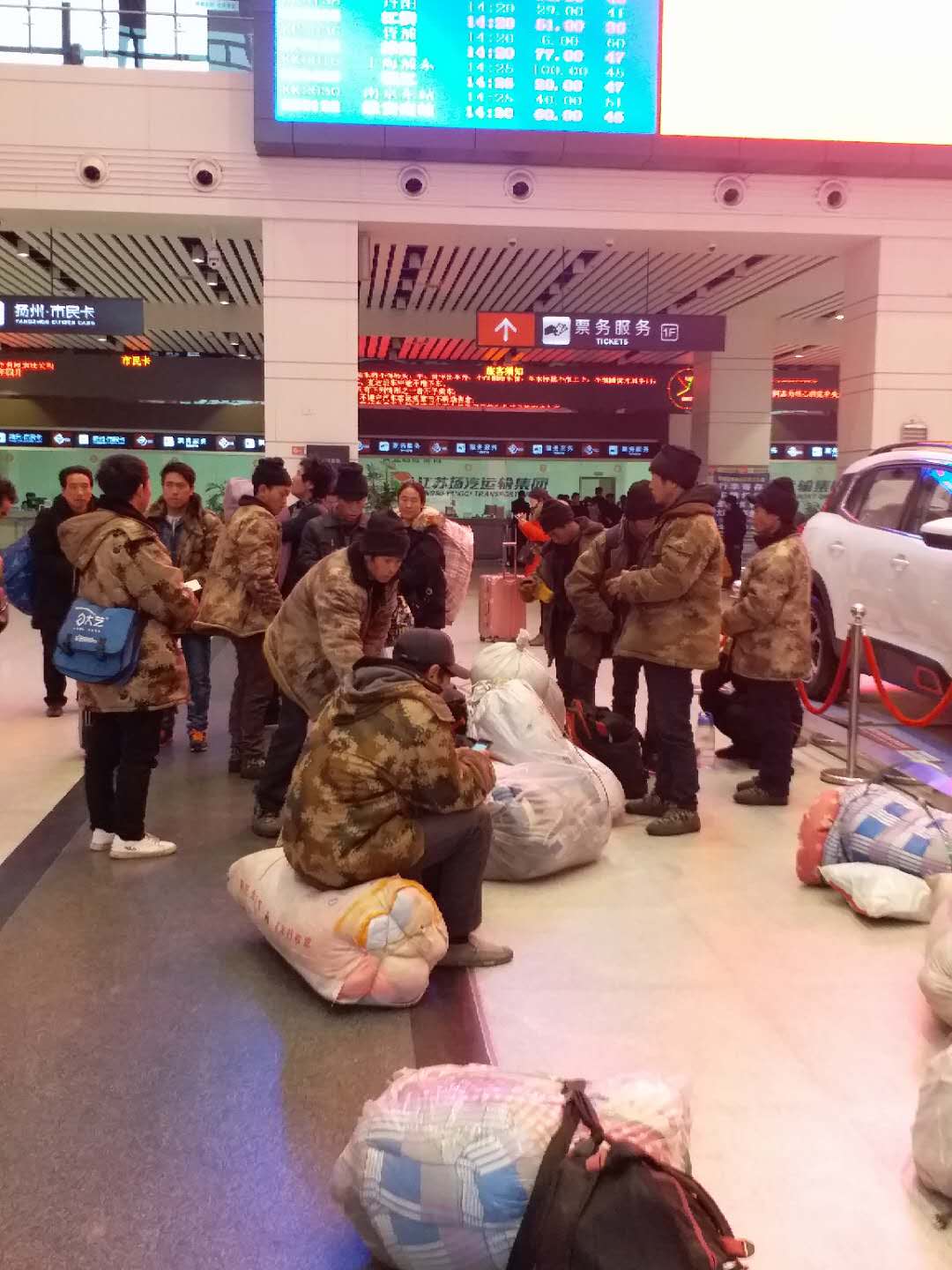 21位在揚(yáng)州某工地打工的安徽無(wú)為縣農(nóng)民工,昨天工地開(kāi)始放假,于是今天大家集中提前返鄉(xiāng)。得知情況后,班長(zhǎng)尹海霞便帶領(lǐng)工作人員熱情地幫助大家購(gòu)買起票來(lái),為節(jié)約因排隊(duì)造成的時(shí)間緊張,尹班長(zhǎng)隨即吩咐班組人員利用工友的手機(jī),幫助農(nóng)民工進(jìn)行網(wǎng)上購(gòu)票,不到二十分鐘,解決了農(nóng)民兄弟的購(gòu)票問(wèn)題。隨行中一位已在揚(yáng)州打工三個(gè)年頭的“小工頭”夏師傅感慨萬(wàn)千,動(dòng)情地說(shuō):“沒(méi)想到今年春運(yùn)前買車票這么容易,多虧了車站工作人員的幫忙”。