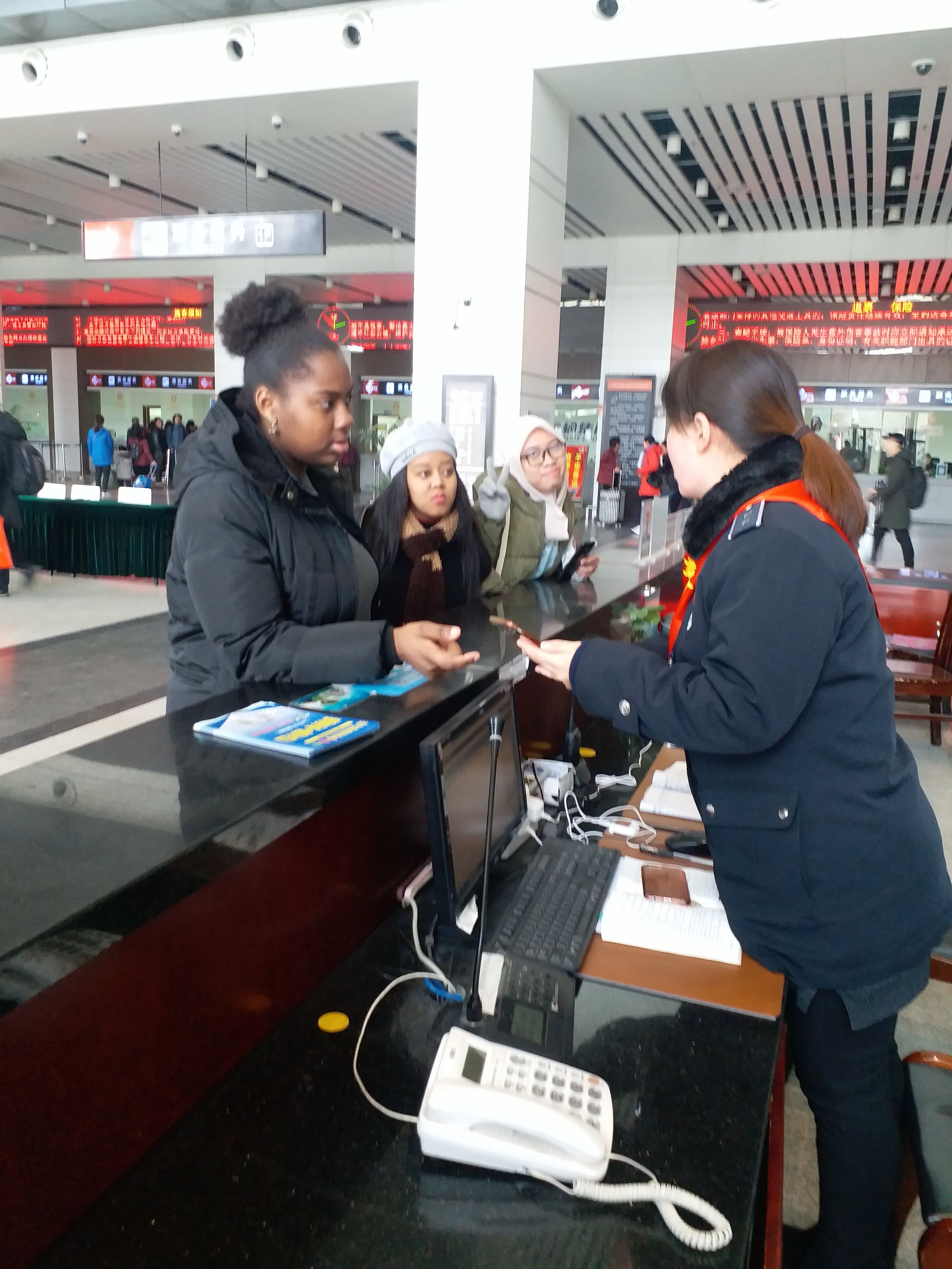 下午12時(shí)30分左右,來自揚(yáng)大的南非和印尼的三位女留學(xué)生,來到車站,想乘車去南通與同鄉(xiāng)會面,到了車站后,才發(fā)現(xiàn)去南通需要到揚(yáng)州汽車東站乘車,而且班次的時(shí)間在兩點(diǎn),一時(shí)性急的三位留學(xué)生沒了主意,操著生硬的中文,來到服務(wù)臺求助。服務(wù)臺工作人員尹海霞熱情地幫助她們查詢了發(fā)往南通的大巴班次,立即為她們購買了已經(jīng)為數(shù)不多的車票?紤]到時(shí)間比較緊,尹海霞又將她們帶到公交上客區(qū),送她們上車,趕往東站。印尼的留學(xué)生上車時(shí)豎著大拇指說道:“車站漂亮,人更漂亮!”