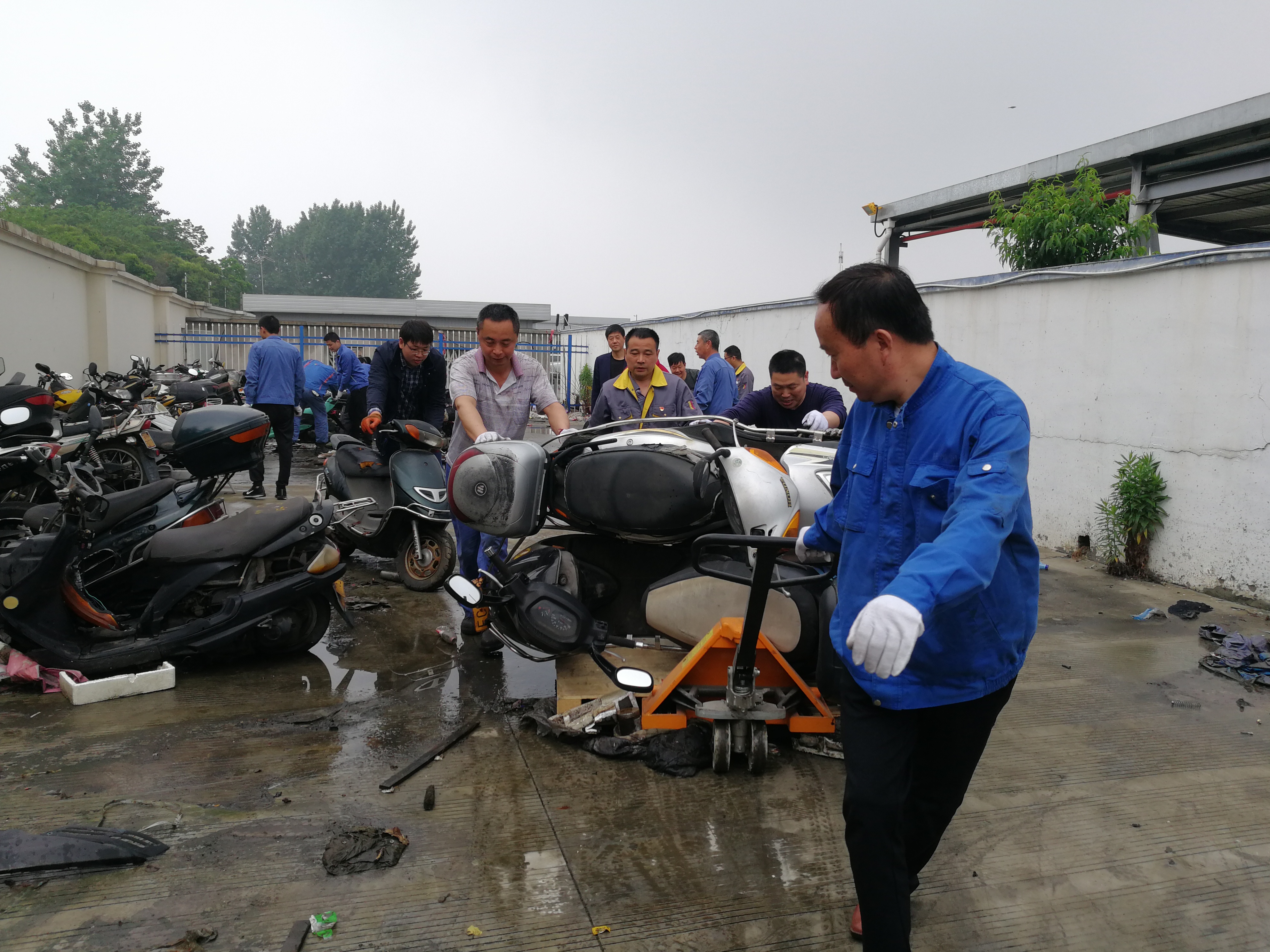 8時(shí)15分搬運(yùn)工作正式開(kāi)始,針對(duì)輪軸銹蝕、車輪變形、車輪遺失、車輪鎖死等不同情況的扣押車輛,大家使用車輪托架、電動(dòng)三輪、托盤叉車等輔助搬運(yùn)工具,共同協(xié)作,聽(tīng)從指揮,一步一步移至指定區(qū)域。經(jīng)過(guò)兩個(gè)半小時(shí)的高效協(xié)作,大家克服場(chǎng)地臟亂和天氣的悶熱,將靠近天燃?xì)饧託庹疽粋?cè)的車輛全部清理完畢,扣押場(chǎng)地車輛在指定停放區(qū)域擺放整齊,消除了安全隱患。